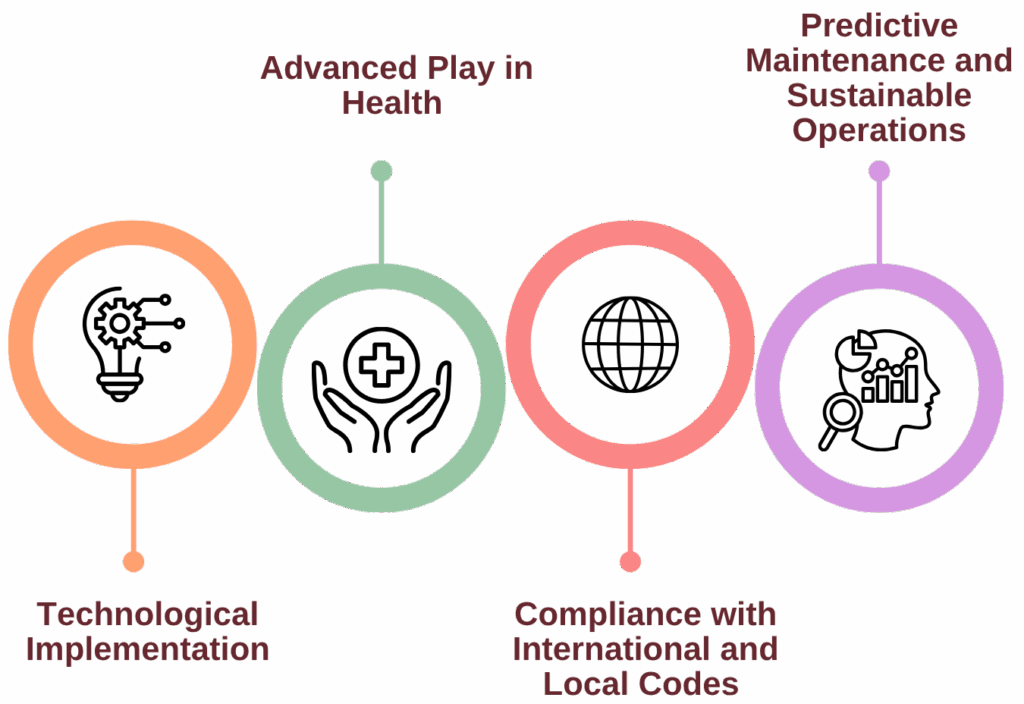 Distinct play zones with strategic planning align with sustainable features. Layouts with adaptable designs and multi-use areas with dining and interactive zones are designed for multi-purpose use, adding versatility to the venue.