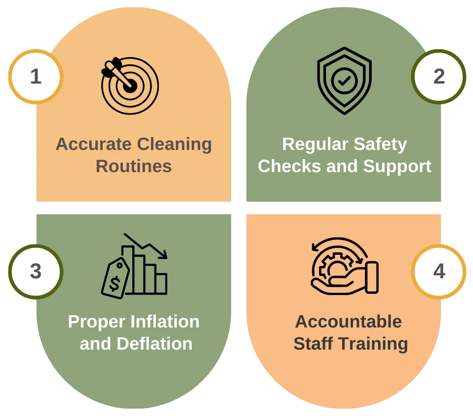 Accountability in staff training for maintenance creates a detailed emphasis on cleaning, documentation, and supervision of equipment. From policy review to practical training, it builds critical thinking as well as understanding emergency needs and proper maintenance strategies. For inflatable-related accidents, an emergency action plan has to be implemented, which establishes a clear procedure for documenting incidents and training staff to take considerable actions in response to challenges.